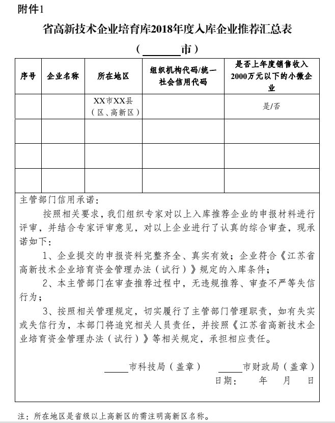 為深入貫徹黨的十九大和省委十三屆三次全會(huì)精神,全面落實(shí)高質(zhì)量發(fā)展要求和“兩聚一高”戰(zhàn)略部署,進(jìn)一步加快高新技術(shù)企業(yè)培育工作,深入實(shí)施高新技術(shù)企業(yè)培育“小升高”計(jì)劃,根據(jù)省財(cái)政廳、科技廳《關(guān)于印發(fā)〈江蘇省高新技術(shù)企業(yè)培育資金管理辦法(試行)〉的通知》(蘇財(cái)規(guī)〔2017〕20號(hào),以下簡稱《管理辦法》)要求,現(xiàn)就江蘇省高新技術(shù)企業(yè)培育庫2018年度入庫企業(yè)申報(bào)工作有關(guān)事項(xiàng)通知如下: