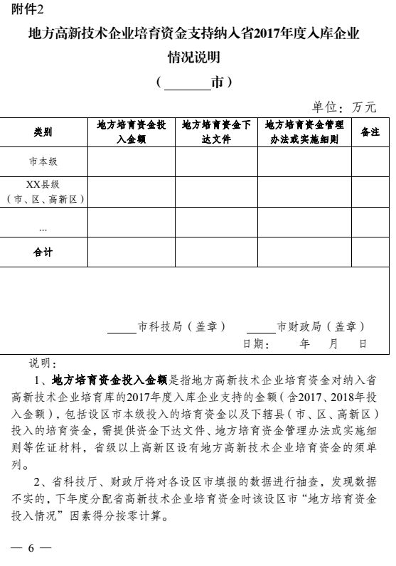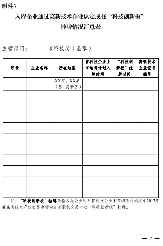 2、各設(shè)區(qū)市科技部門會(huì)同同級(jí)財(cái)政部門于5月15日前聯(lián)合行文將推薦入庫企業(yè)名單(含電子版表格)、地方高新技術(shù)企業(yè)培育資金支持納入省2017年度入庫企業(yè)情況說明、地方培育資金下達(dá)文件、地方培育資金管理辦法或?qū)嵤┘?xì)則、入庫企業(yè)通過高新技術(shù)企業(yè)認(rèn)定或列入省科技企業(yè)上市培育計(jì)劃并于2017年度在省技術(shù)產(chǎn)權(quán)交易市場內(nèi)江蘇股權(quán)交易中心“科技創(chuàng)新板”掛牌情況匯總表(見附件1、2、3)等材料,一式兩份統(tǒng)一報(bào)送至委托受理單位——省生產(chǎn)力促進(jìn)中心。企業(yè)向所在地縣(市)、高新區(qū)科技部門提交申報(bào)材料的截止時(shí)間以地方通知為準(zhǔn)。