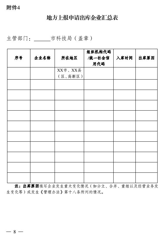 5、各設(shè)區(qū)市科技部門要加強(qiáng)對(duì)入庫企業(yè)的跟蹤與監(jiān)督,對(duì)發(fā)生重大變化(如分立、合并、重組以及經(jīng)營業(yè)務(wù)發(fā)生變化等)后不符合入庫條件的,或在入庫申請(qǐng)過程中存在嚴(yán)重弄虛作假行為的,以及培育期間發(fā)生重大安全、重大質(zhì)量事故或有嚴(yán)重環(huán)境違法行為的,及時(shí)填報(bào)“地方上報(bào)申請(qǐng)出庫企業(yè)匯總表”(見附件4),并正式行文報(bào)請(qǐng)省科技廳予以出庫,取消其培育資格。