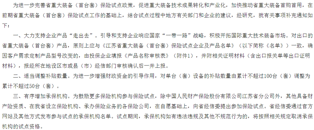 (3)首臺套保險試點項目:列入《省重大裝備(首臺套)保險試點企業(yè)及產(chǎn)品名單》的重大技術(shù)裝備(產(chǎn)品)。