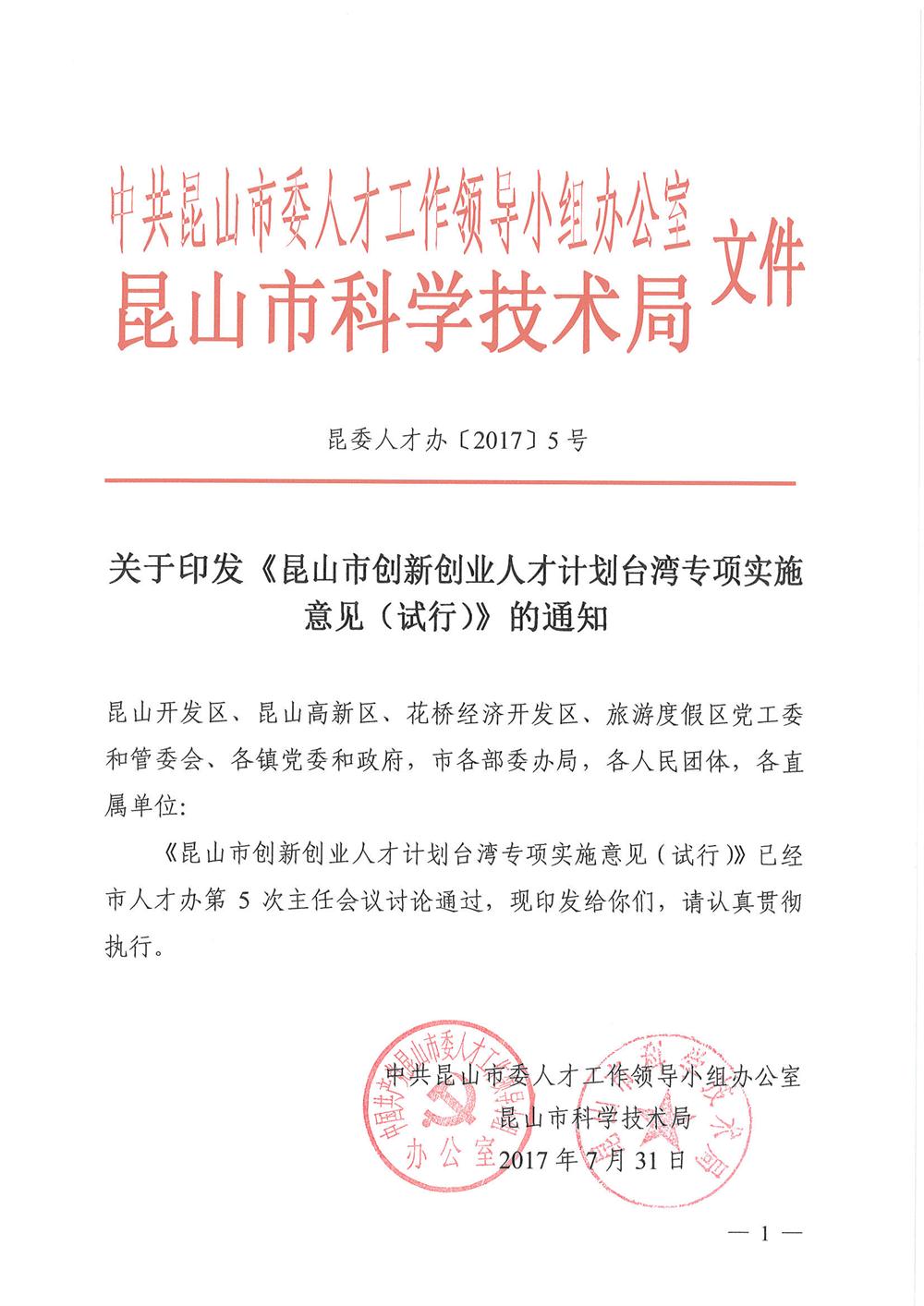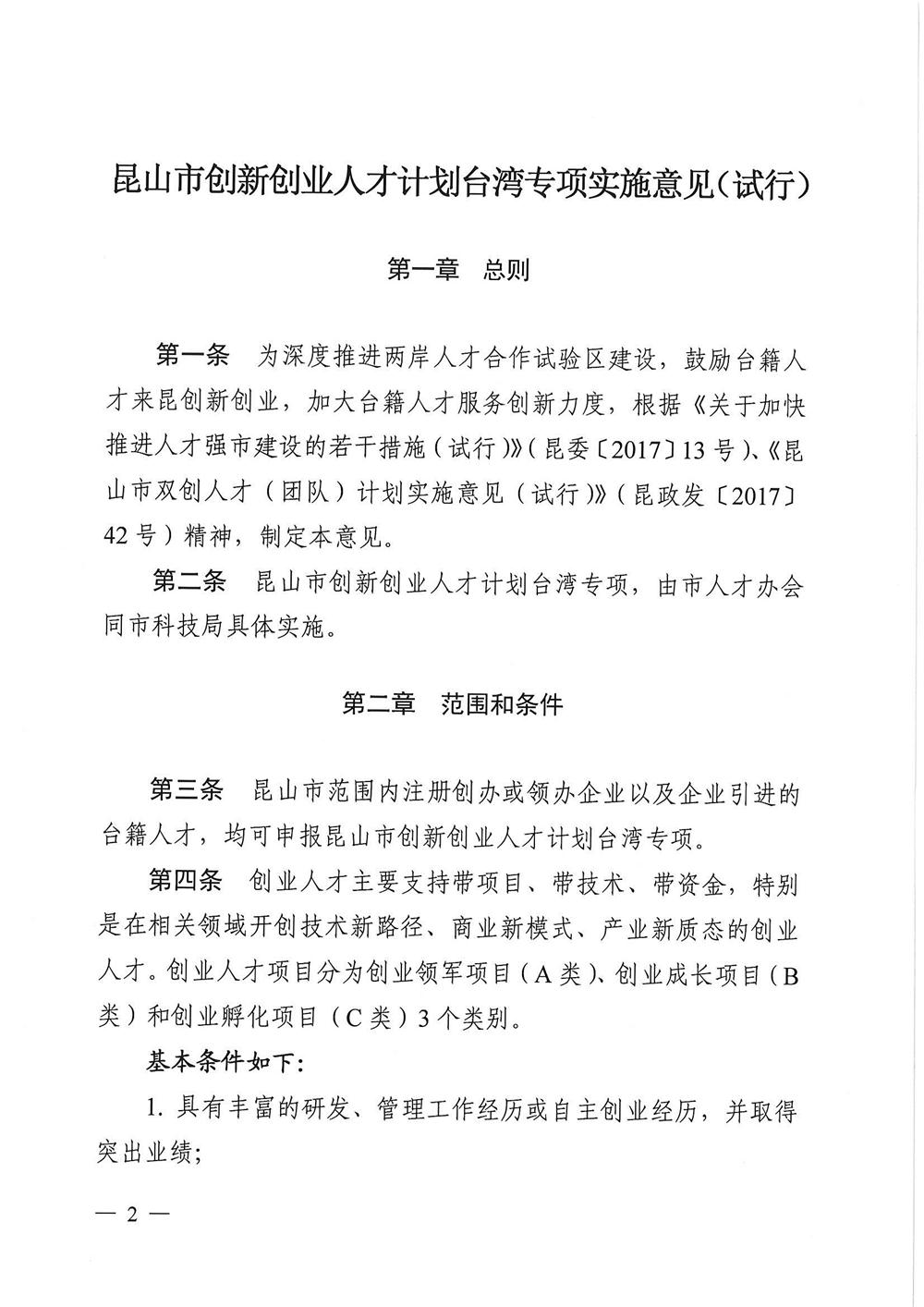 昆山市創(chuàng)新創(chuàng)業(yè)人才計(jì)劃臺灣專項(xiàng)實(shí)施意見(試行)