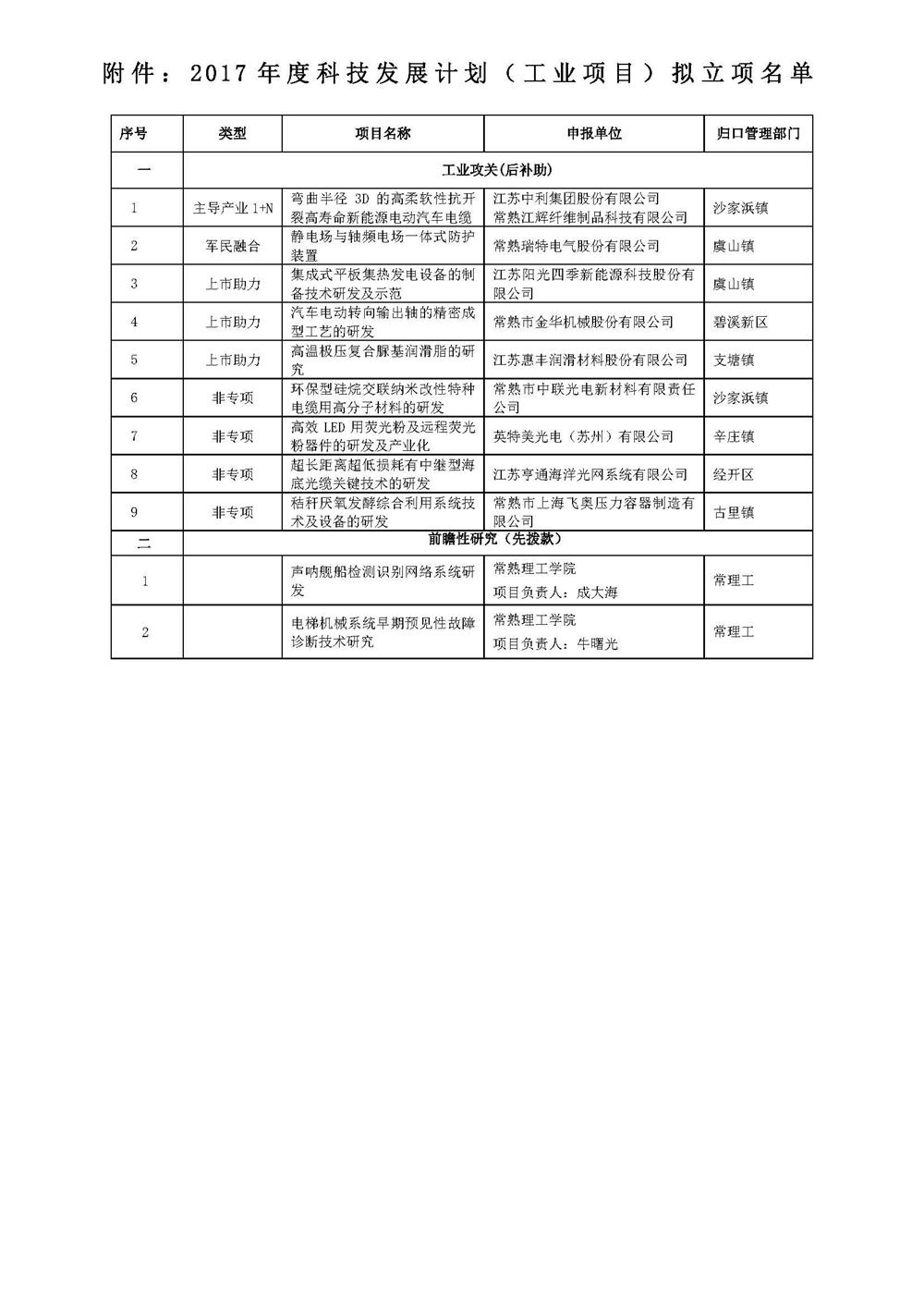 2017年度常熟市科技發(fā)展計(jì)劃(工業(yè)項(xiàng)目)擬立項(xiàng)名單