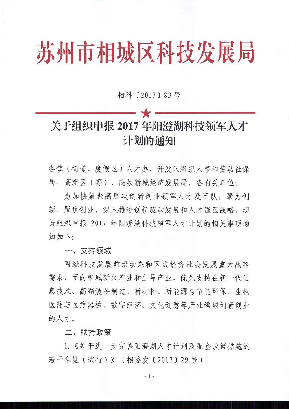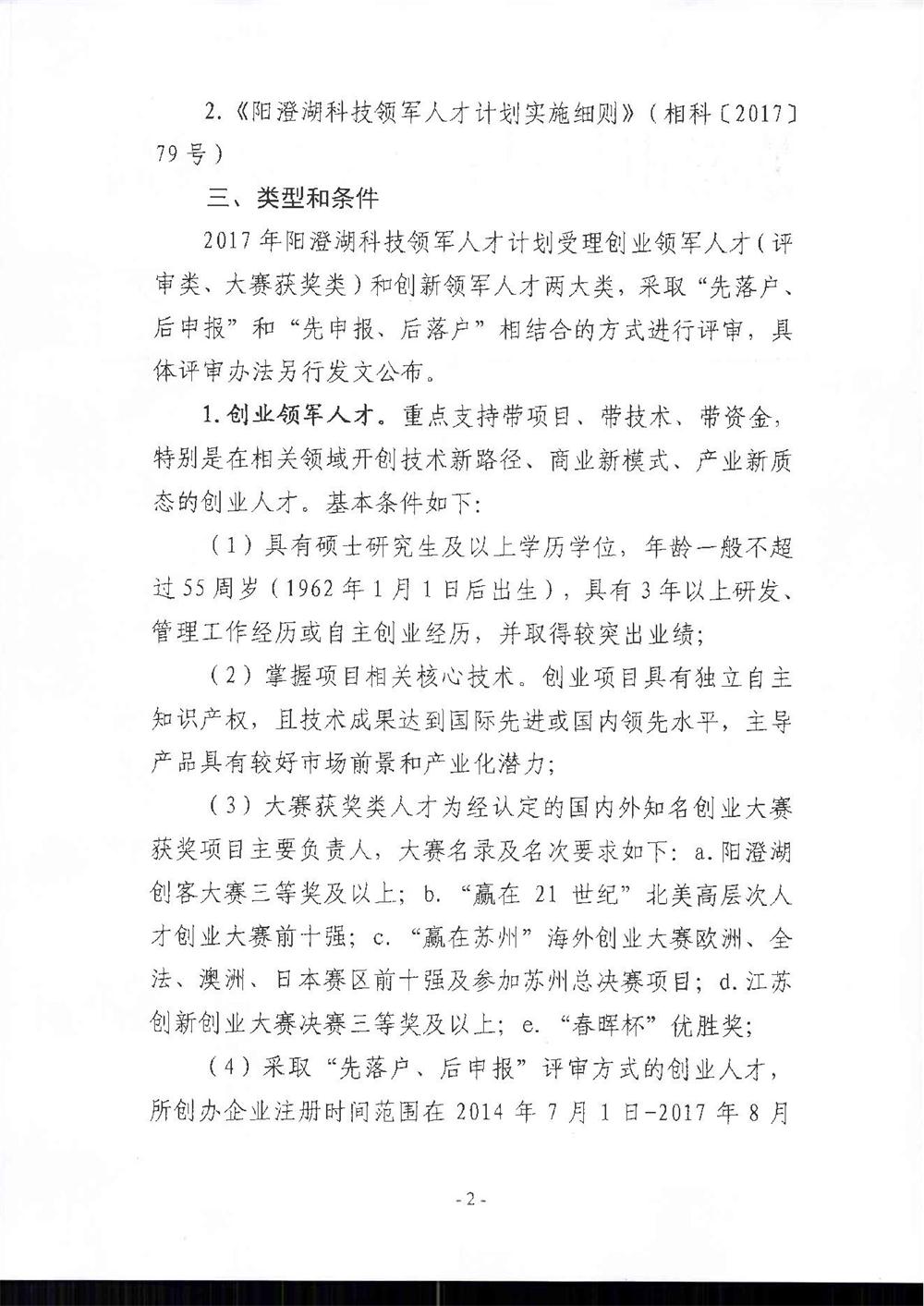 關(guān)于組織申報(bào)2017年陽(yáng)澄湖科技領(lǐng)軍人才計(jì)劃的通知