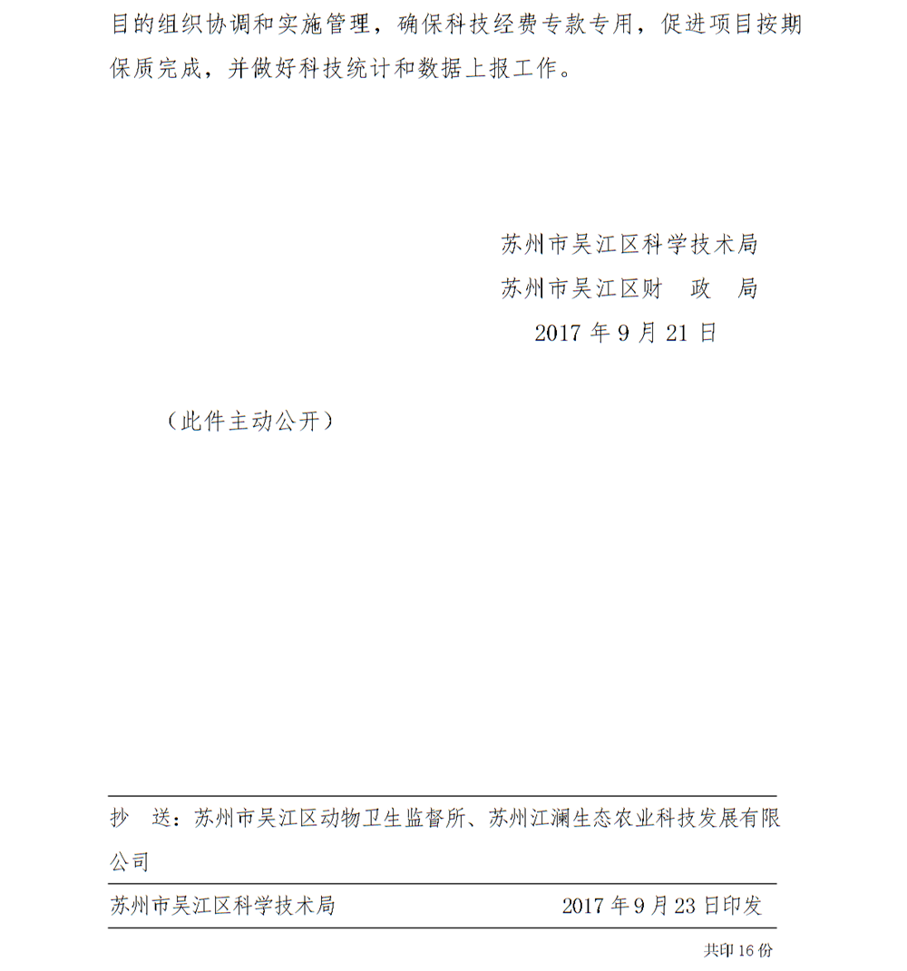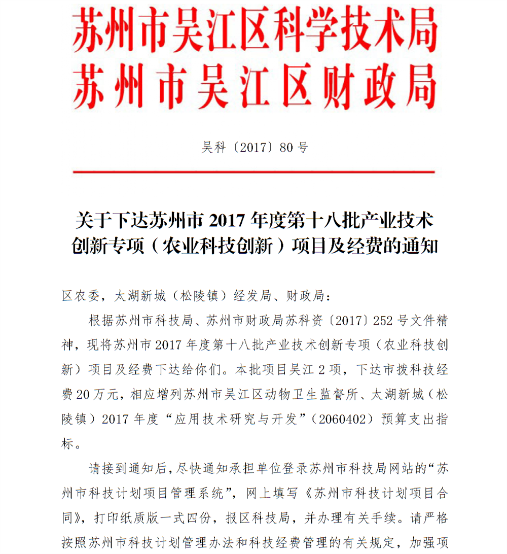 關(guān)于下達(dá)蘇州市2017年度*十八批產(chǎn)業(yè)技術(shù)創(chuàng)新專項(xiàng)(農(nóng)業(yè)科技創(chuàng)新)項(xiàng)目及經(jīng)費(fèi)的通知
